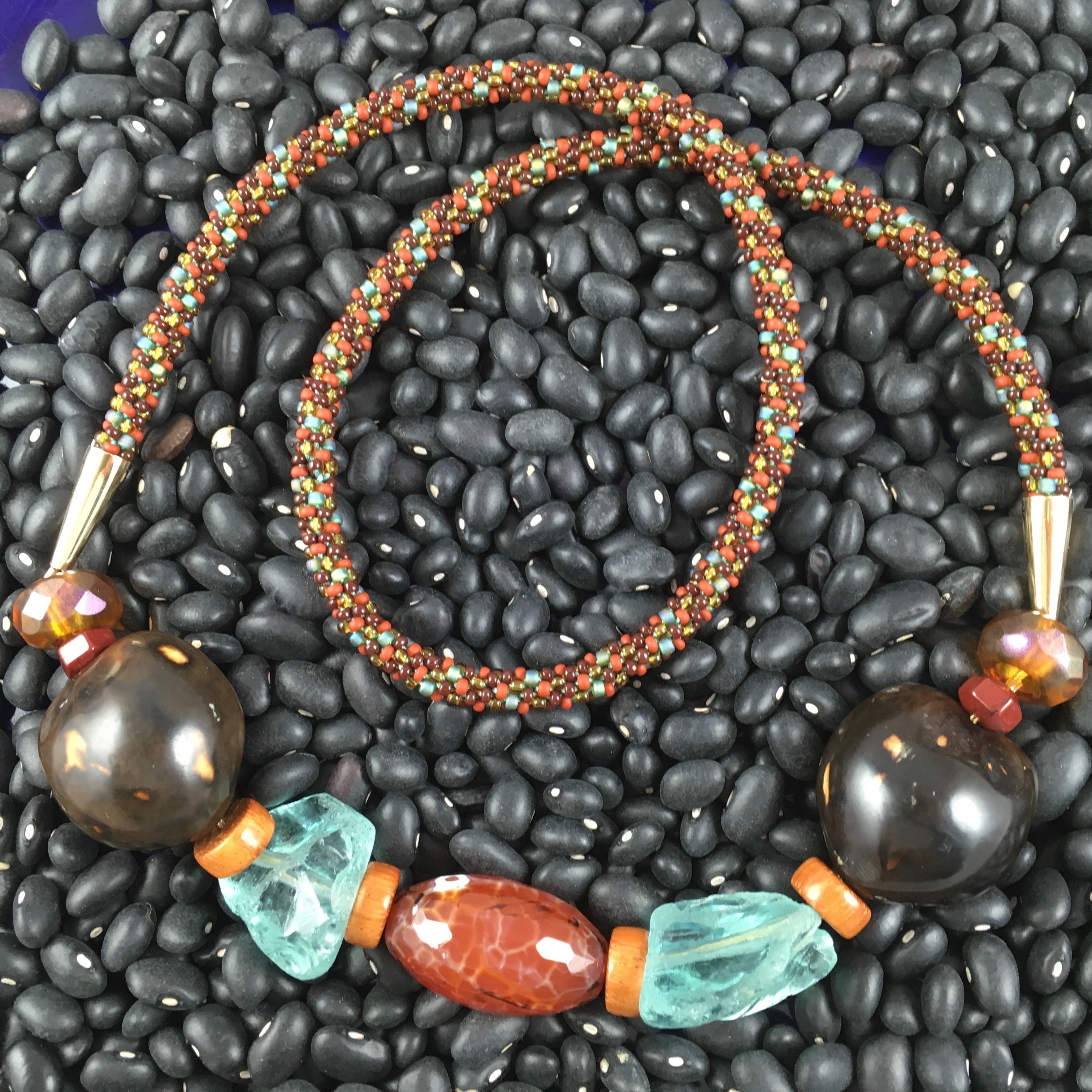 Claspless earth-toned kumihimo necklace (simply slips over head) supporting a centerpiece made of an ellipsoid of faceted fire agate, speckled dark brown kukui nuts, rough cut aqua quartz,faceted red jasper, bamboo wood rondelles, and amber glass rondelles, with gold-filled cones & findings. A very comfortable necklace to wear!